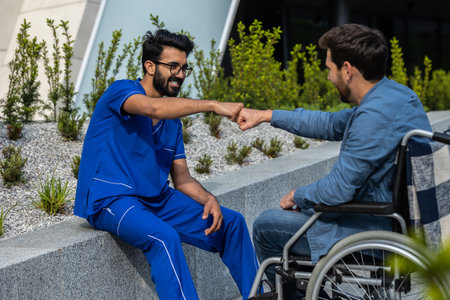 Male nurse in blue doctors overall shaking hands with a patient in wheelchair