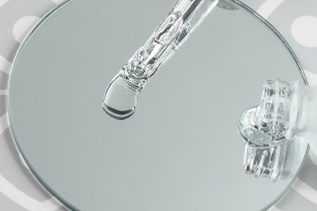 Pipette, dropper with serum drops on mirror, cosmetic techologies