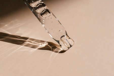 Close up of transparent serum or oil glass mock up on bottle on light background. Drops of liquid in a pipette. Concept of natural organic cosmetic and beauty, cosmetology, dermatology.