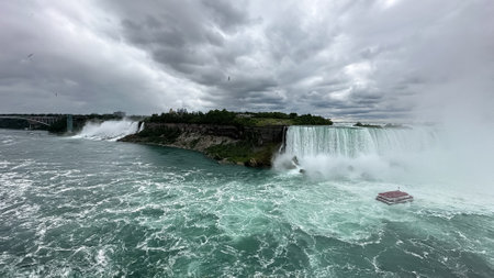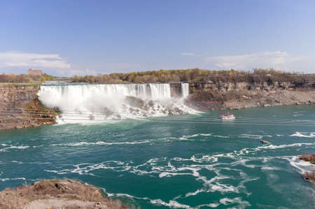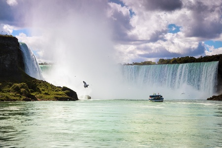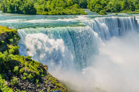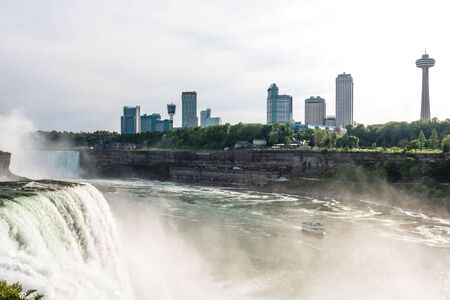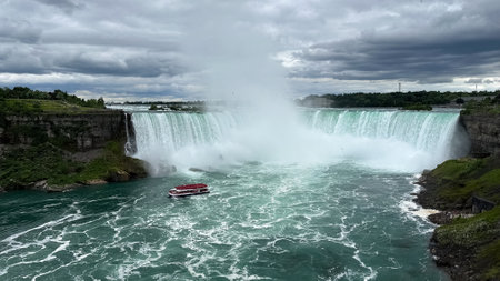 Beautiful view of Horseshoe Falls, largest of three waterfalls of Niagara Falls. Boat with tourists is in close proximity to waterfall jets and rising water cloud. View from Canadian side. Sunny day.