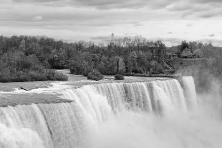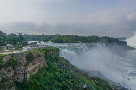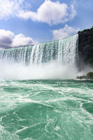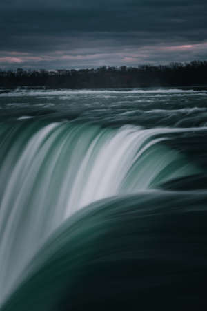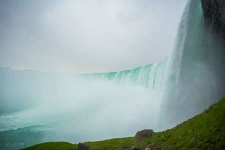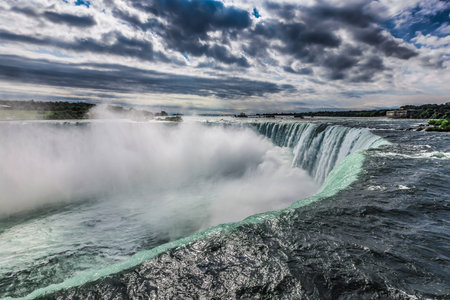 View of the impressive Niagara Falls. Horseshoe falls from the Canadian side of the falls. Massive water falls under the cloudy sky. Spume of the splashing water of the falling water