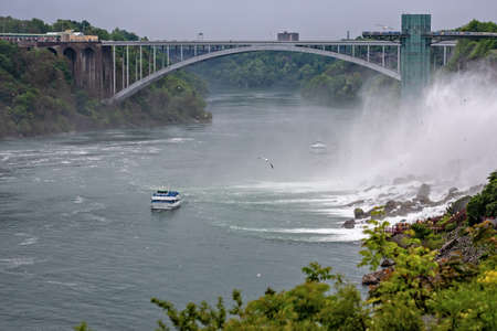 Rainbow Bridge over river and tourist boat under the American Falls, which are part of Niagara Falls