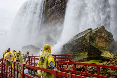 Niagara Falls, NY, USA - June 13, 2019: visitors in raincoats on a wet wooden stairs go on a tour under the splashes of American Falls