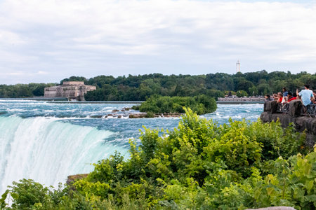 Niagara Falls, Onterio, Canada - 30 July 2023: Tourists gather near Niagara Falls, admiring the powerful waterfall and lush greenery under a cloudy sky.