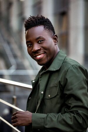 Portrait of African young man in casual shirt smiling at camera against the white wall