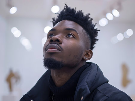 Young man of color, contemplative at art show, admiring contemporary sculptures in a serene gallery ambiance