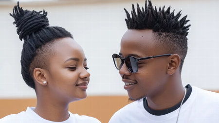A young couple shares a tender moment outdoors, showcasing joy and connection. Their stylish looks and warm smiles highlight their affectionate bond.