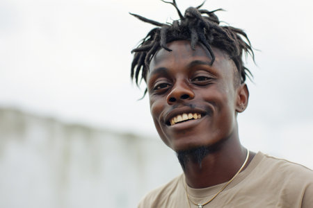 Young handsome African man happy face smiling looking at the camera. Positive person. AI generated
