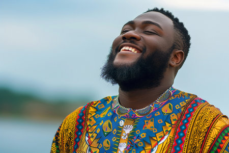AI Generated. An African man is in national cloth pose and smile on gray background