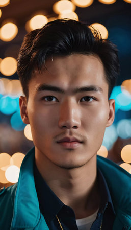 A confident young asian man stands in the busy city, illuminated by glowing lights.
