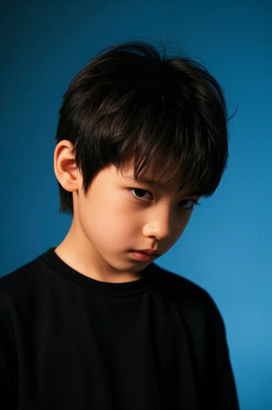 Portrait of asian boy on blue sky background, outdoor shot