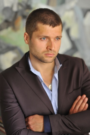 Portrait of businessman, young man in suit with his arms crossed looks at camera.