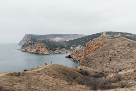 Woman stands on cliff overlooking ocean, cloudy day provides soft lighting. Shes wearing a yellow sweater wearing dark pants. Landscape features rugged terrain, calm waters.