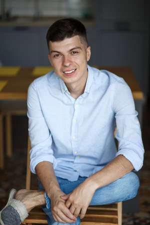 handsome stylish young guy sits in the kitchen on a chair. holding foot on a foot. dressed in blue jeans and a blue shirt.