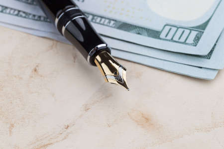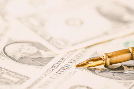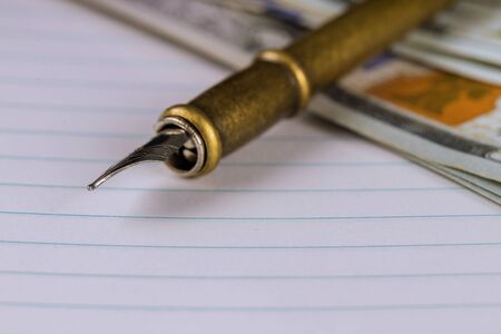 Retro vintage ink pen on american dollar money cash background. Bookkeeping and accounting business finance concept