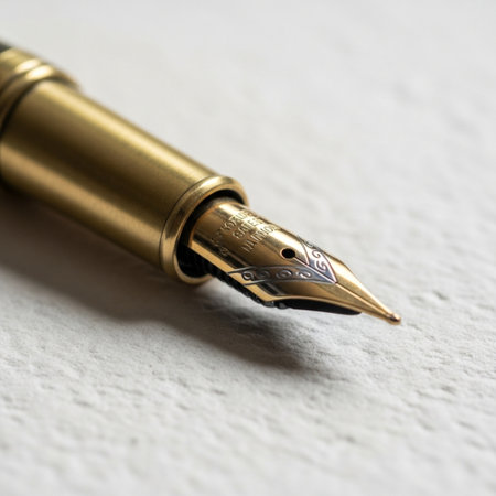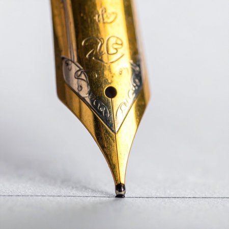 A macro view captures the exquisite detail of a classic gold fountain pen nib as it makes contact with a clean sheet of paper.