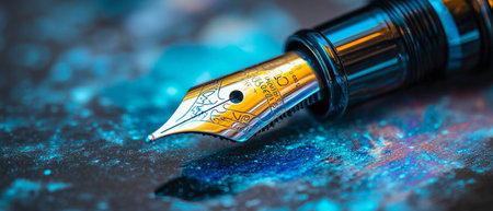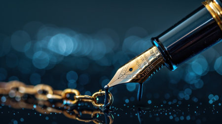 Close-up image of an elegant fountain pen featuring a gold nib and a shiny chain, beautifully set against a dark background with blue bokeh, perfect for artistic or luxury themes.