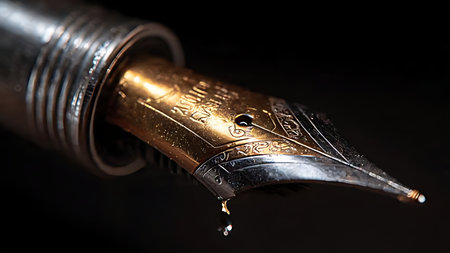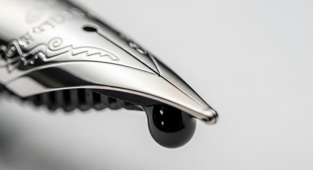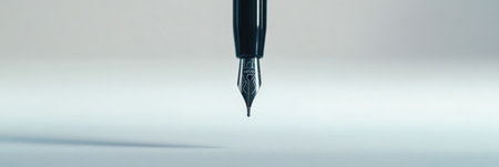 Elegant fountain pen nib hovering above a blank page, with a drop of ink forming at its tip, embodying creativity, writing, and the art of storytelling