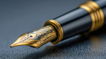 A finely crafted black and gold nib with ornate engravings rests on a textured background, highlighting craftsmanship and refined elegance.
