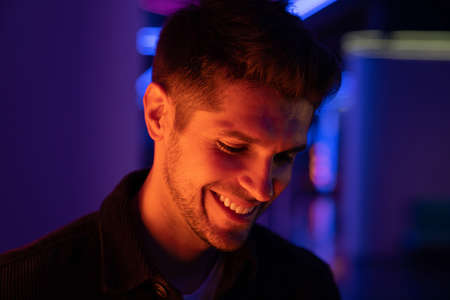 Close up portrait of smiling young handsome guy texting, chatting with friends, using smartphone late at night at home