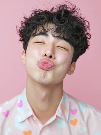 Vibrant and Playful Portrait Photograph of a Charming and Friendly Young Korean Man with a Bright Joyful Smile and Lively Facial Expression Against a Soft Pink Background