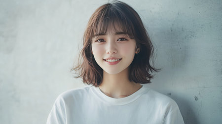 A very pretty Japanese woman, 20 years old, wearing a casual t-shirt, smiling warmly at the camera, simple and fresh appearance.