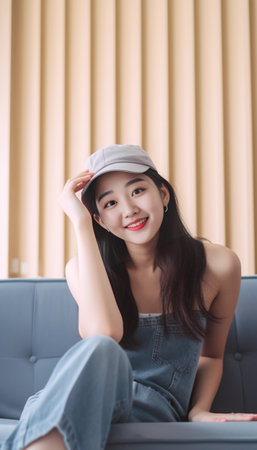 Stylish Japanese woman confidently posing in a bright room. Fashionable young lady striking a pose in a colorful creative studio environment, collaborating with a luxurious fashion brand.