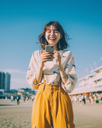 Generative AI : a girl is laughing after reading a message on her smartphone at the seaside tecnhology and lifestyle concept