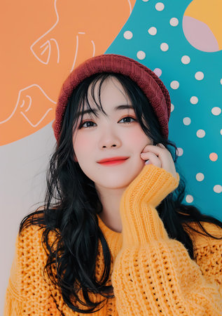 Smiling Asian Woman Wearing Yellow Sweater and Red Beanie