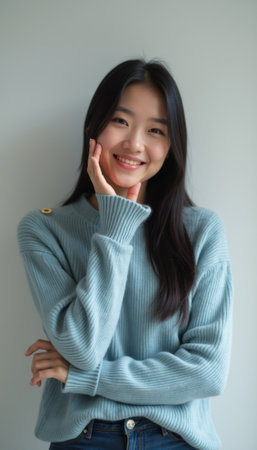 A cheerful young woman with long dark hair smiles warmly while resting her chin on her hand, exuding a sense of joy and confidence. The soft blue sweater complements her radiant expression, creating a serene and inviting atmosphere