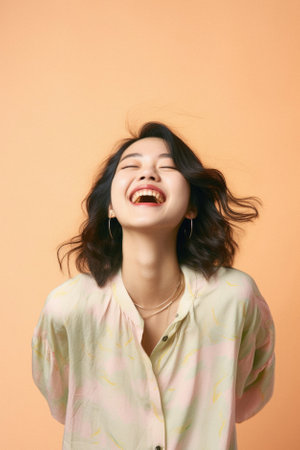 Portrait of a beautiful Asian woman laughing and looking up on orange background.