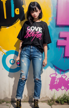 A captivating portrait of a confident young woman showcasing artistic apparel. The unique design and striking lighting create a powerful visual impact, embodying style and individuality.