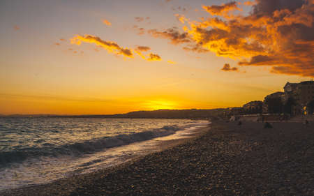 Yellow and orange colored sunset at seaside in Nice, Cote dAzur, France