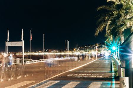 Nice, France - 16 September 2024: Night view of the Promenade des Anglais pedestrian zone with palm trees and blurred people, captured with long exposure.