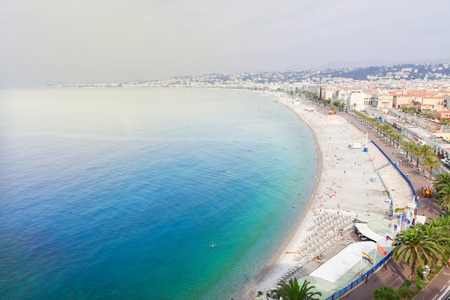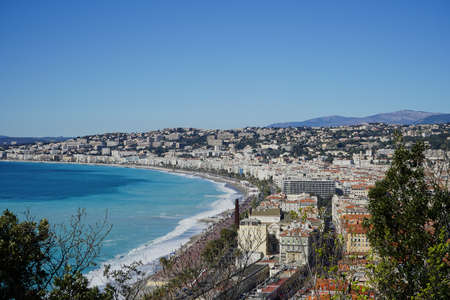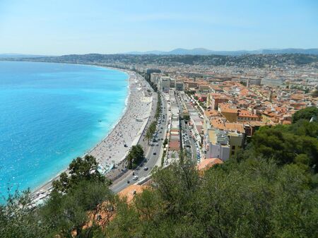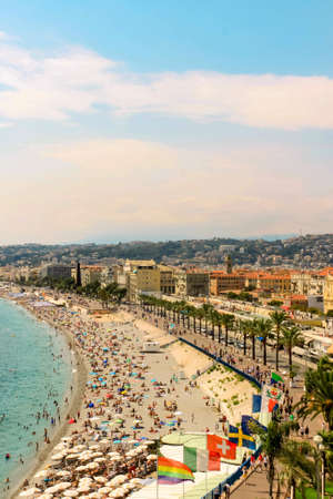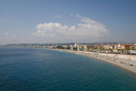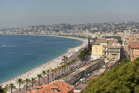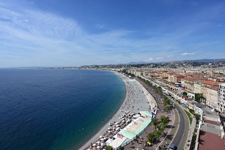 Panoramic view of Nice coastline and beach with blue sky, France. Summer