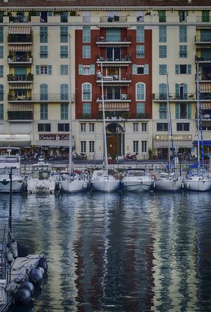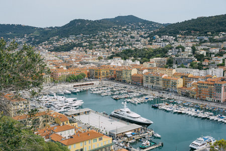 Nice, France - 01 June 2023: View of the port of Nice, moored yachts and boats, and the brightly colored facades of the surrounding houses