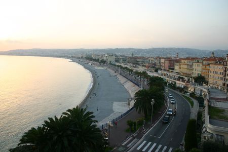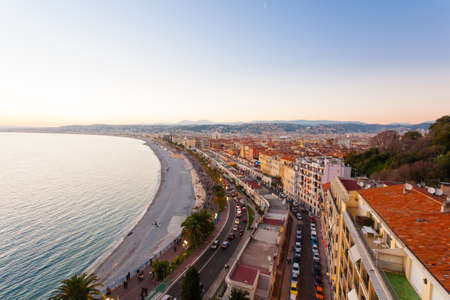 Beautiful sunset is by a summer warm evening in Nice View on the Promenade des Anglais, France, Europe Cote D Azur