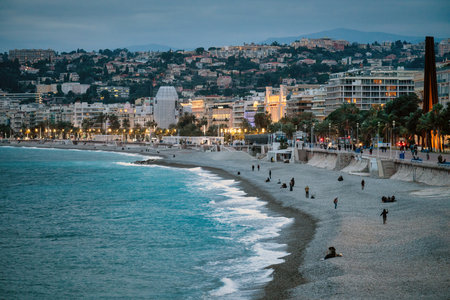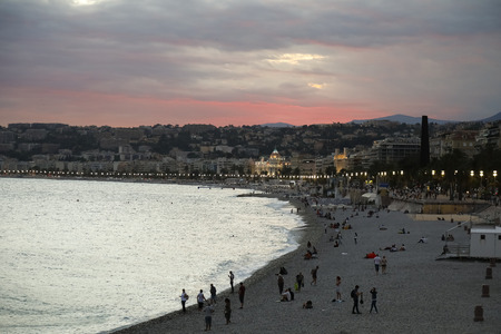 Nice, France - September 24, 2018: People are still on the beach, but The Bay of Angels, Cote d'Azur is already seen at late evening. There are buildings of the city already illuminate by street lamps