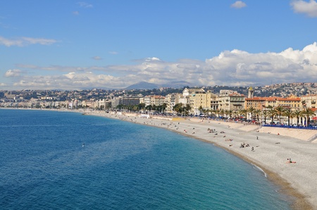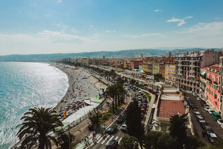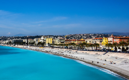 Nice beach day landscape, France. Nice beach and famous Walkway of the English, Promenade des Anglais. Famous French touristic town