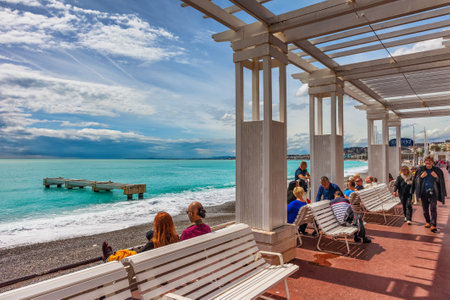 Nice, France - April 16, 2018: People both local and tourists relax at pergola on Promenade des Anglais on French Riviera by the Mediterranean Sea