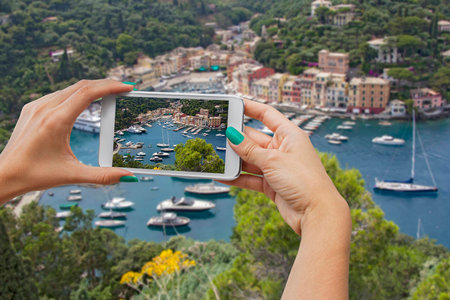 A woman photographing with mobile phone, Portofino, Cinque Terre, Italy