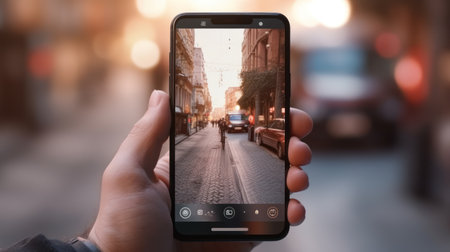 closeup shot of person holding mobile phone in hand and taking photo of sunset at sea, nature photography with smartphone