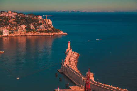 The lighthouse at the Port of Nice on the Mediterranean Sea at Nice, France along the French Riviera.