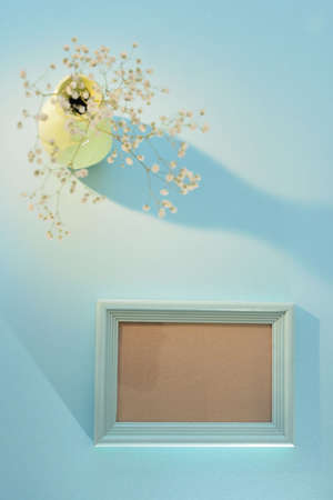 Minimal background image of graphic empty frame on pastel blue wall, picture mock up
