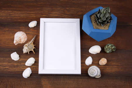 top view succulent in concrete pot and white wooden frame with place for text or summer memories picture