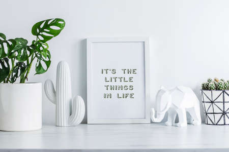 Creative desk with mock up white frame, cacti, plant and elephant figures. White and natural concept.