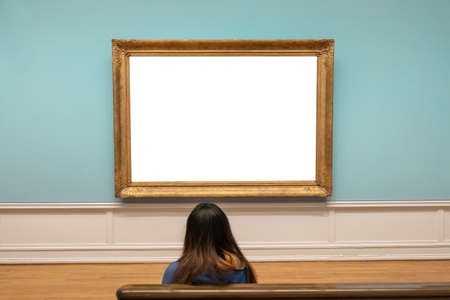 Spectator looking blank large golden frame on blue wall in art gallery