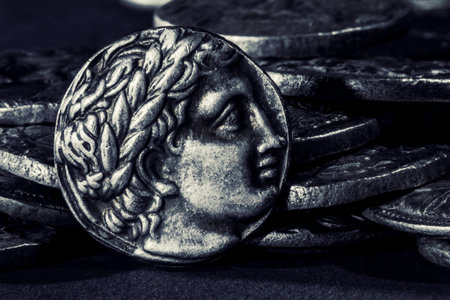 A beautifully engraved coin reveals a regal figure, showcasing intricate designs and textures. Soft light illuminates the metallic surface, highlighting artistry and historical significance.