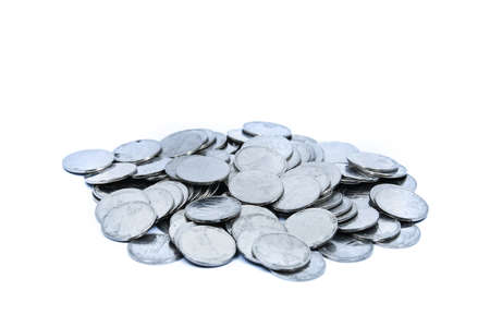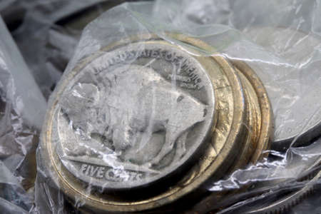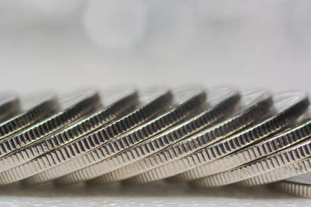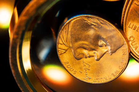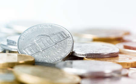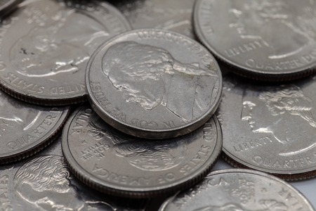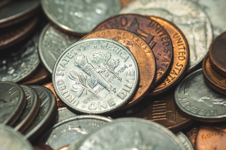 American coins closeup including quarters, nickels and dimes, selective focus. One dime