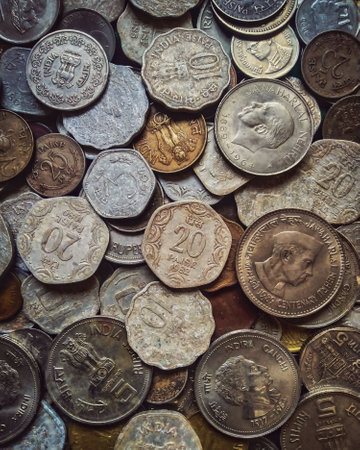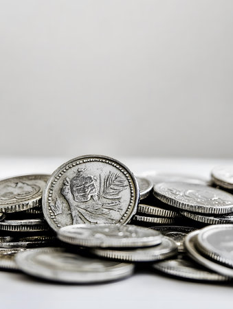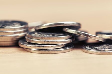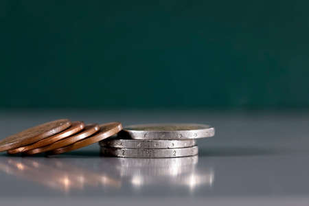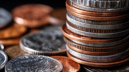 Stacked coins in various denominations create visually appealing arrangement, showcasing metallic textures and colors of currency. image evokes sense of value and finance